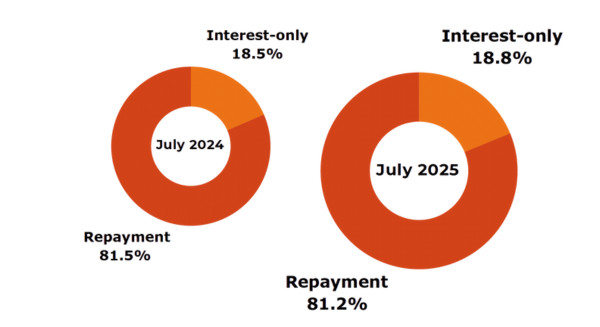 “Despite the affordability pressures of the past two years, there’s been no meaningful shift towards interest-only borrowing. In July, 81.2% of new loans were on a repayment basis – virtually identical to a year ago – showing that interest-only remains a niche part of the market.