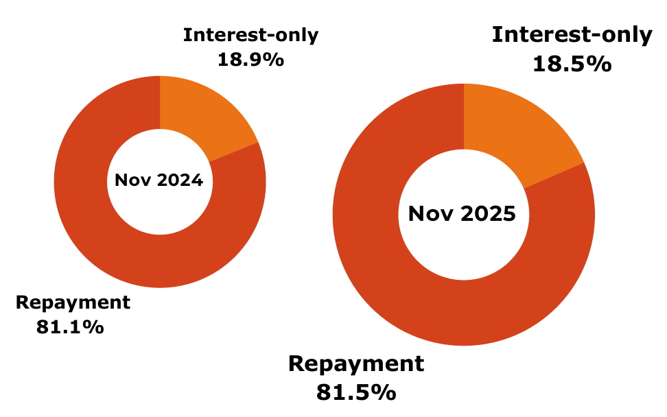 “The split between repayment and interest-only mortgages has remained largely unchanged over the past year, with interest-only loans continuing to account for roughly one in five mortgages. These deals tend to be taken out by borrowers with higher incomes, significant bonuses, or clear repayment strategies in place, such as the sale of a second property.”