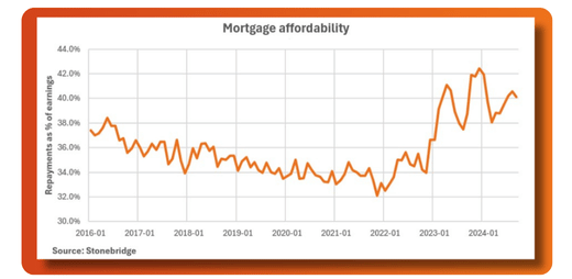 Borrowers are forking out more than two-fifths of their salary on mortgage repayments thanks to rising house prices and elevated borrowing costs, new data from Stonebridge shows.